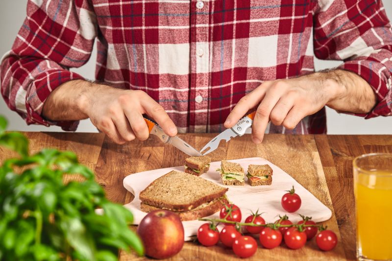 Sada outdoorových příborů z nerezové oceli s oranžovými plastovými rukojeťmi ze skelného vlákna je nezbytnou výbavou pro každé dobrodružství. Příbor lze pomocí tří rukojetí rozdělit na nůž a vidličku. Kempingový nůž i kempingovou vidličku s integrovaným otvírákem na lahve lze složit pro bezpečnou přepravu. Délka (v zavřeném stavu): 93 mm