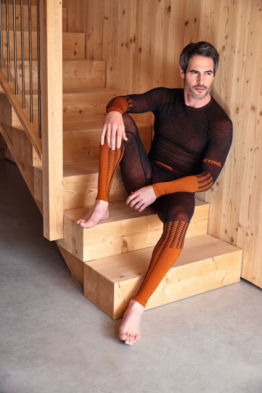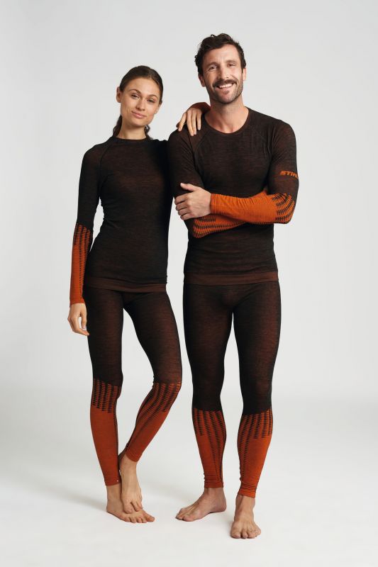 Dlouhé spodní prádlo STIHL pro sport a volný čas ze směsi lyocellu a merina. Kalhoty jsou v tmavě šedé melanžové barvě s pleteným vzorem malých řetězových pil v oranžové barvě. V pase je zdůrazněné pletené logo STIHL a řetězová pila.