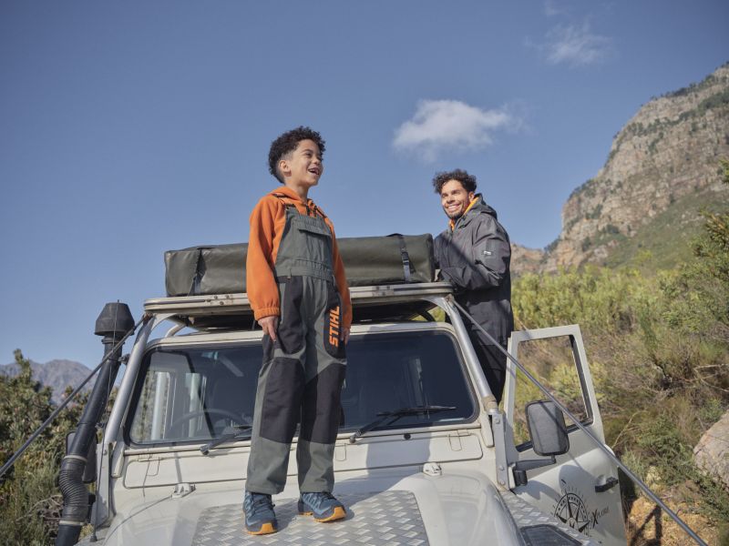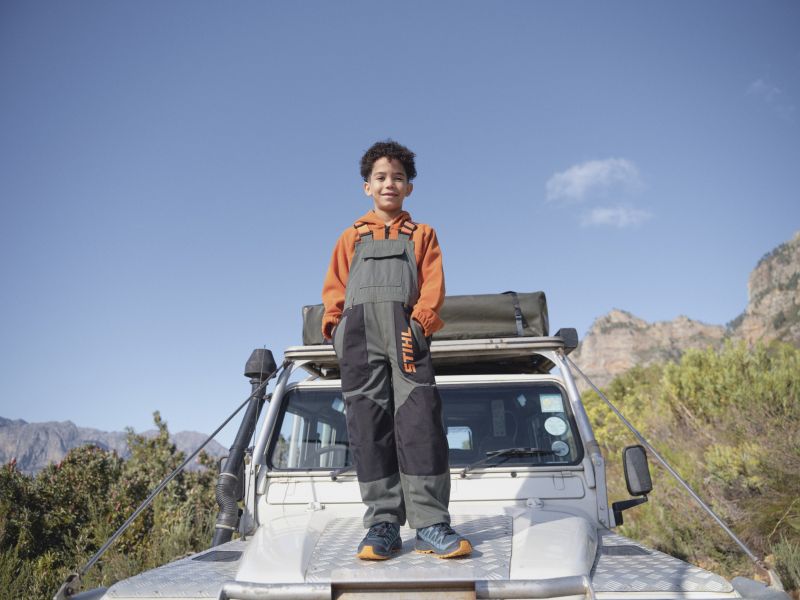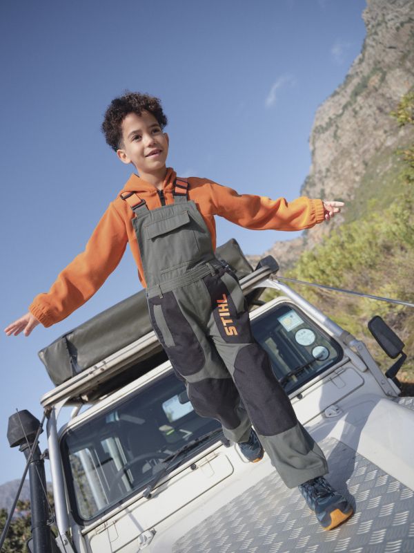 Vejde se do nich všechno: nářadí, šroubky, sladkosti... Odolné kalhoty s laclem v zelené barvě nabízí spoustu prostoru s mnoha kapsami. Nastavitelný pas zajišťuje pohodlné nošení a padnoucí střih. Kalhoty mají praktické nastavitelné popruhy a elastickou část na zádech. Na levém stehně je oranžové logo STIHL.