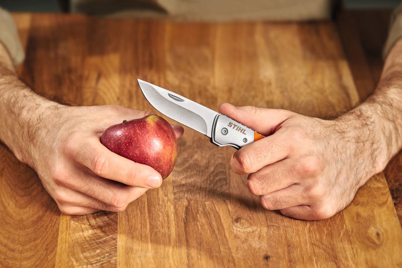 zavíracího nože s uzamykatelnou čepelí je vyrobena z matné nerezové oceli a laminátu ze skelných vláken v oranžové barvě a s velkou výdrží – je tedy ideální pro outdoorová dobrodružství.