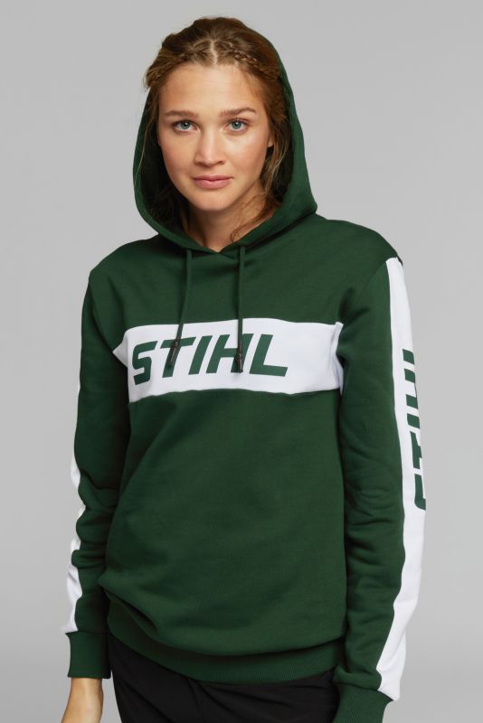 Zeleno-bílá barevná mikina s kapucí pro muže i ženy. Na hrudi a na pažích je velké zelené logo STIHL. Mikina je vyrobena ze 100% bavlny a z vnitřní strany je počesaná, aby se pohodlně nosila.