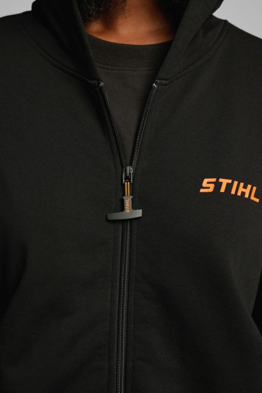Jednoduchá černá mikina s kapucí a zipem STIHL ElastoStart. Tričko na sebe, přes něj mikina a hotovo. Bunda má neodnímatelnou kapuci, dvě kapsy na zip a logo STIHL jako 3D potisk na hrudi.