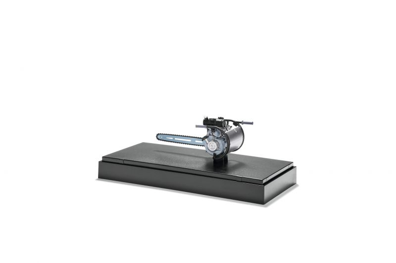 Sběratelský model historické pily Typ BL. Materiál: odlitek těžkého zinku, nabarveno do dobových barev. Umístěno na plastovém podstavci a zakryto plastovým sklem od firmy Schuco. Měřítko 1:12.