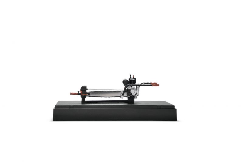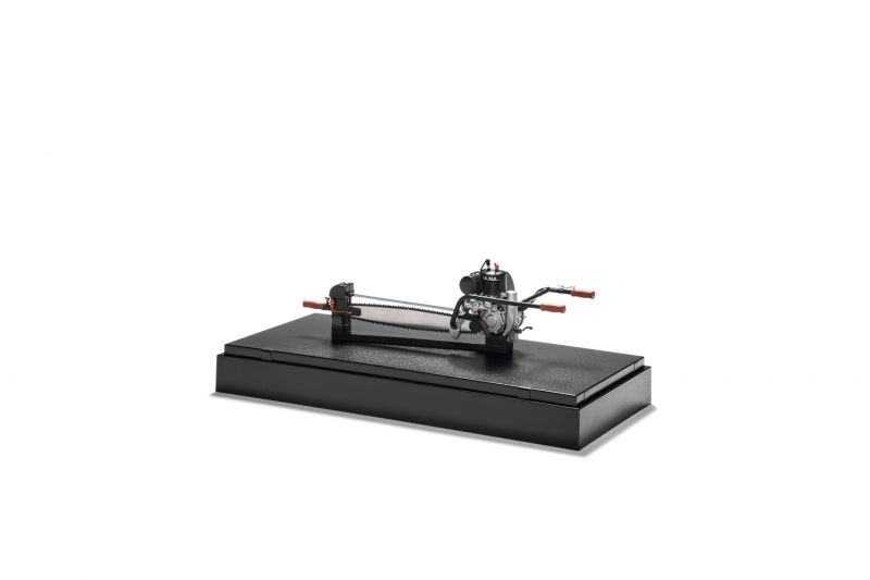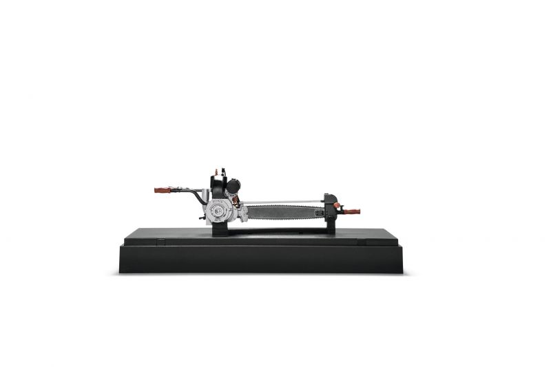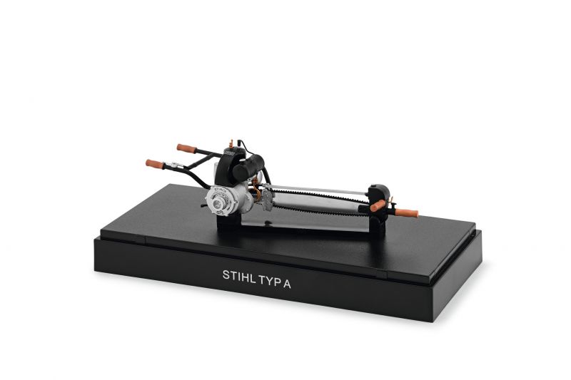 Sběratelský model historické pily Typ A. Materiál: odlitek těžkého zinku, nabarveno do dobových barev. Umístěno na plastovém podstavci a zakryto plastovým sklem od firmy Schuco. Měřítko 1:12.