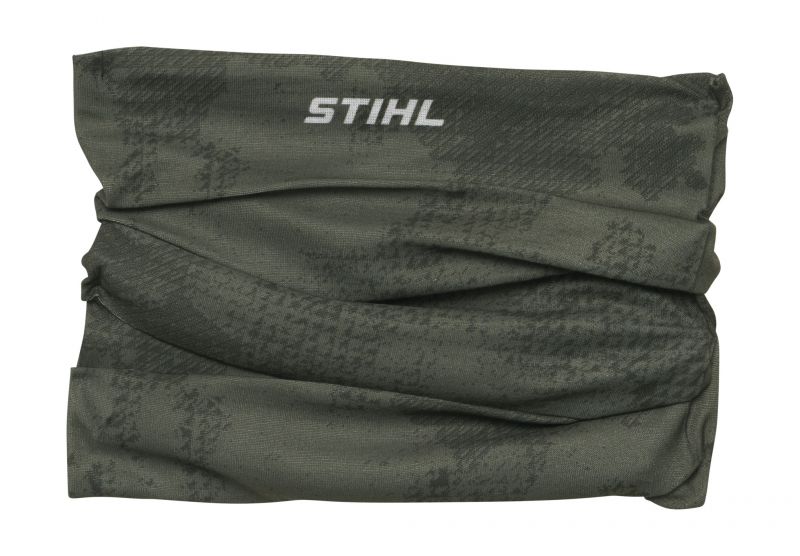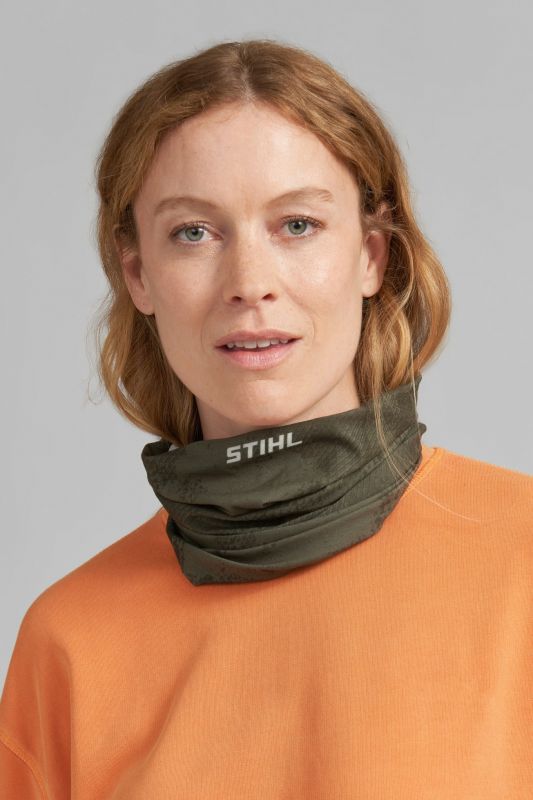 Multifunkční kruhový šátek v pixelovém vzoru s decentním logem STIHL v bílé barvě. K dostání v oranžové a zelené barvě.