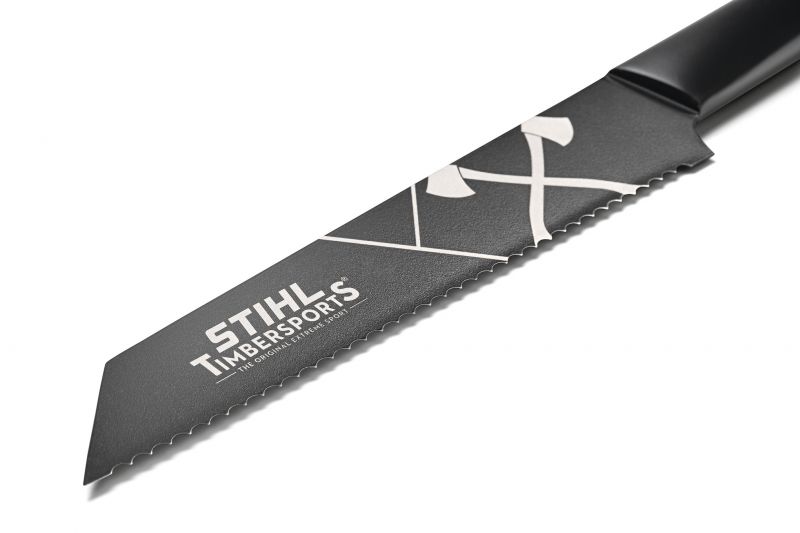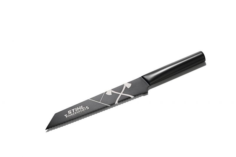 Krájejte chleba jako sportovní dřevorubec! S tímto jedinečným nožem na chleba v designu TIMBERSPORTS® není problém. Nůž je ostrý a pohodlně padne do ruky. Dodává se s ochranou čepele ve vzhledu záštity motorové pily. Ideální dárek: jedinečný vzhled ve vysoce kvalitním balení. Udělá z vás hvězdu v každé kuchyni. Celková délka: 32 cm, délka čepele: 20 cm, lze mýt v myčce nádobí.
