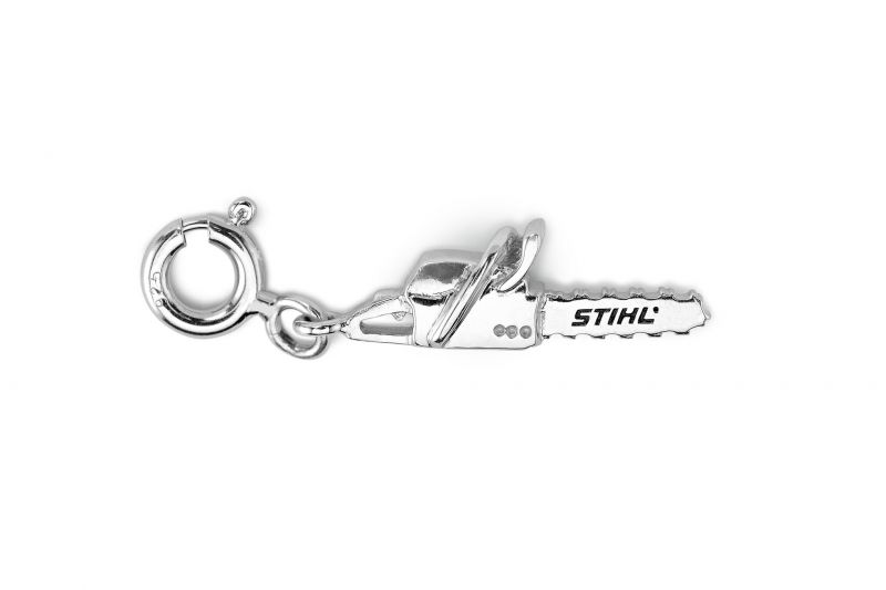 Závěsná motorová pila z rhodiovaného stříbra 925 je výjimečným kouskem a pomocí malé karabinky ji lze připevnit na všechny běžně dostupné přívěskové náramky, perlové náramky a dámské řetízky. Celková délka: 23 mm