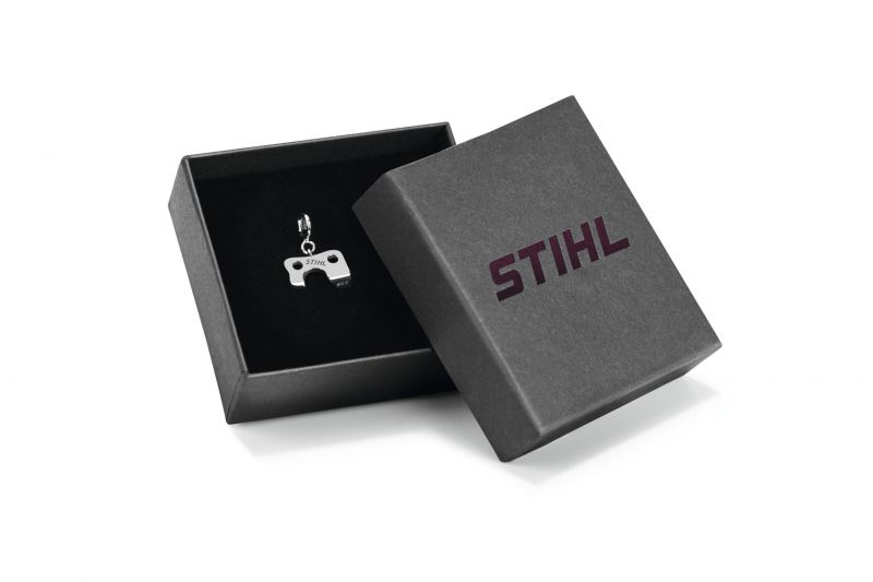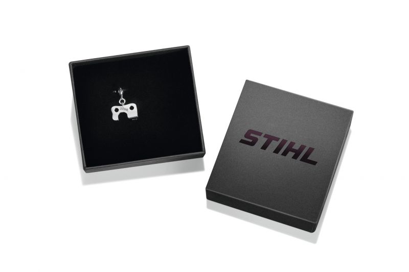 Náš další přívěsek je miniaturní řetězový článek. Je vymodelován podle originálního článku řetězu pily STIHL, je 18 mm dlouhý a vyrobený z rhodiovaného stříbra 925.