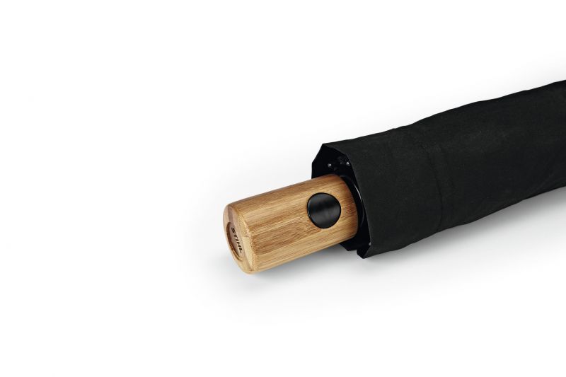 "Malý, ale šikovný." Praktický kapesní deštník s bambusovou rukojetí a kovovými koncovkami se otevírá a zavírá automaticky. Potah je vyroben ze 100% polyesterového pongee (recyklovaný plast v souladu s normou STANDARD 100 by OEKO-TEX®). Malý reflexní potisk řetězové pily STIHL ve stříbrné barvě na každém druhém segmentu. Průměr deštníku: cca 98 cm