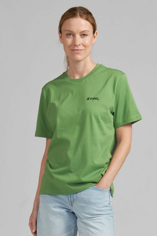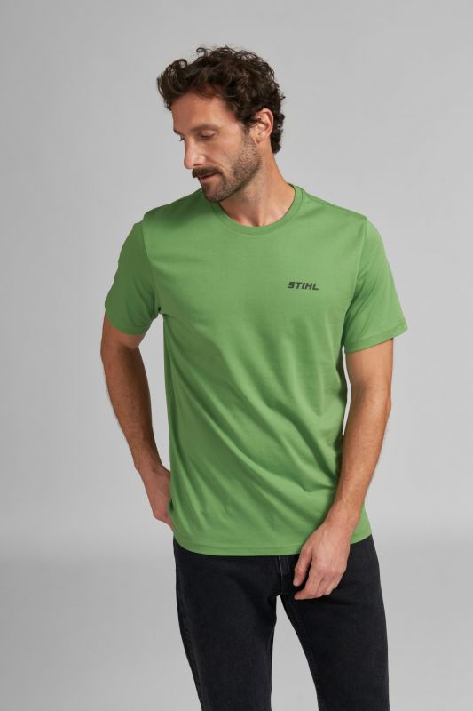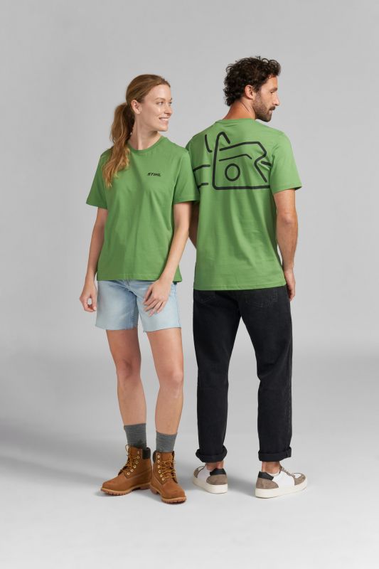 Unisex tričko v zelené barvě v regular fit střihu. Na hrudi je malý potisk loga STIHL a na zádech velká ikona pily. Jednoduchý žerzejový materiál ze 100% organické bavlny je udržitelný a zajišťuje pohodlné nošení.